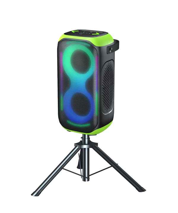 רמקול בגודל ועוצמה בינונית כולל חיבוריות בלוטוס וUSB סוללה נטענת Type C ללא צורך בחיבור חשמל קבוע כולל עמוד בגובה מטר